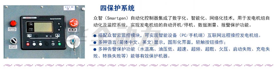 眾智(Smartgen)自動(dòng)化控制器集成了數(shù)字化、智能化、網(wǎng)絡(luò)化技術(shù),用于發(fā)電機(jī)組自動(dòng)化及監(jiān)控系統(tǒng),實(shí)現(xiàn)發(fā)電機(jī)組的自動(dòng)開機(jī)/停機(jī)、數(shù)據(jù)測(cè)量、報(bào)警保護(hù)功能。 ● 搭配眾智云監(jiān)控模塊,可實(shí)現(xiàn)智能設(shè)備(PC/手機(jī)端)互聯(lián)網(wǎng)遠(yuǎn)程操控發(fā)電機(jī)組。 ● 多種語言(簡(jiǎn)體中 文、英文)顯示,圖形化界面,輕觸按鈕操作; ● 多種告警保護(hù)功能(水溫高、油壓低、超速、超頻、超載、欠壓、啟動(dòng)失敗、充電失敗、轉(zhuǎn)換失敗等)能夠有效保護(hù)機(jī)器。