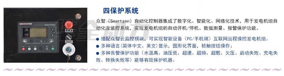 四保護(hù)系統(tǒng) 眾智(Smartgen)自動化控制器集成了數(shù)字化、智能化、網(wǎng)絡(luò)化技術(shù),用于發(fā)電機組自動化及監(jiān)控系統(tǒng),實現(xiàn)發(fā)電機組的自動開機/停機、數(shù)據(jù)測量、報警保護(hù)功能。